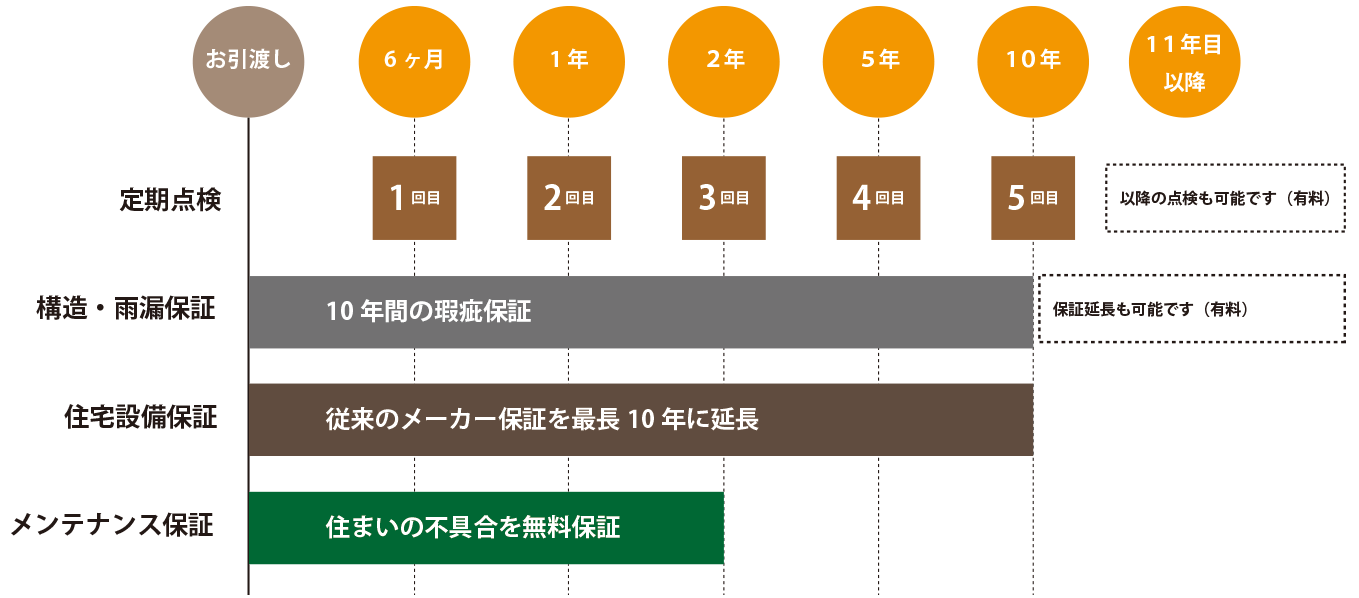 住宅保証機構によるまもりすまい保険制度を活用して、主要構造部や雨漏りについて10年間保証をいたします。
