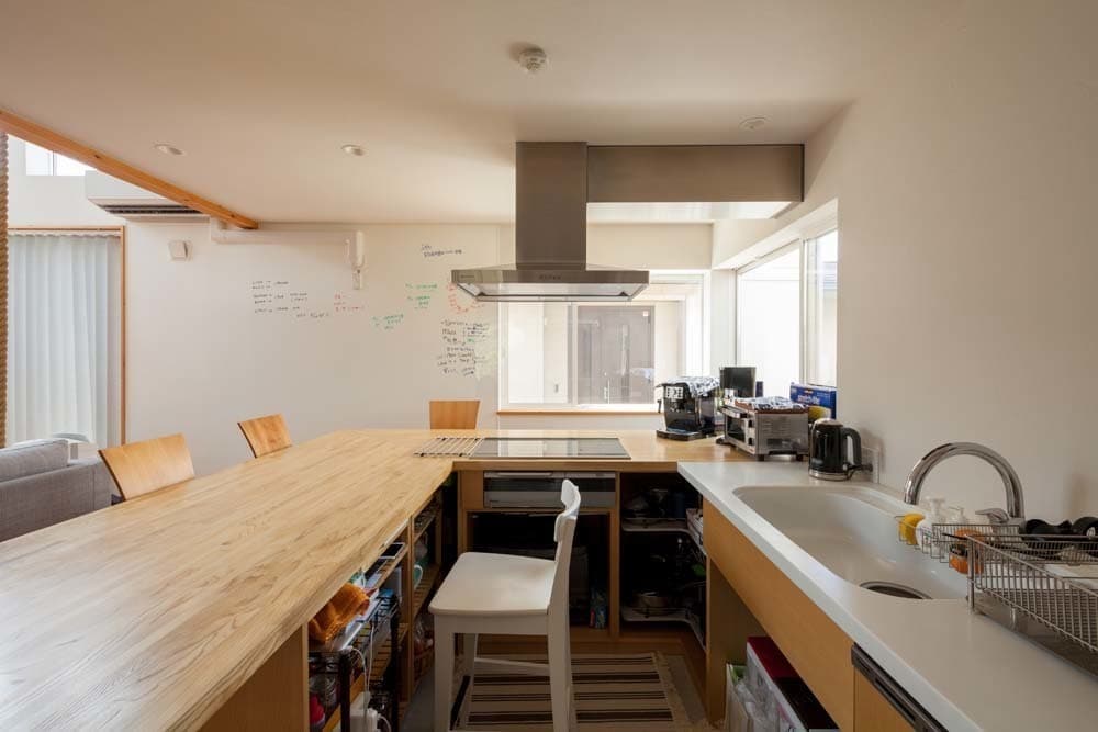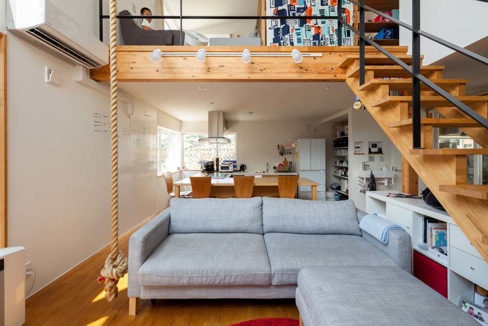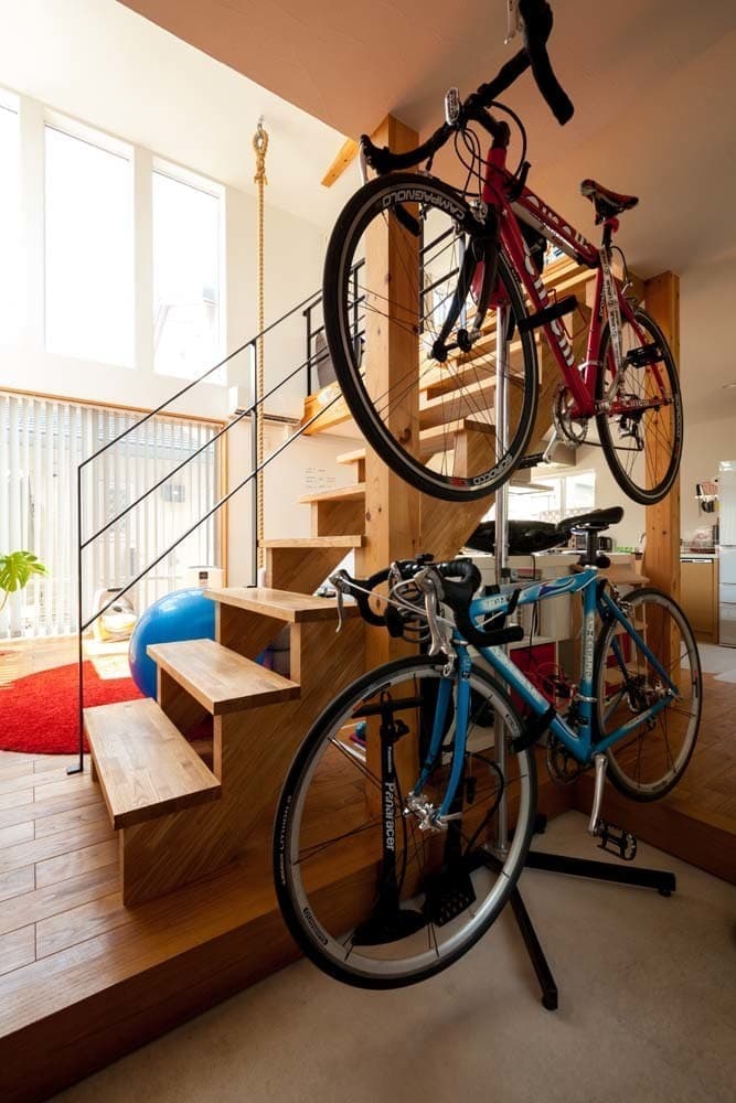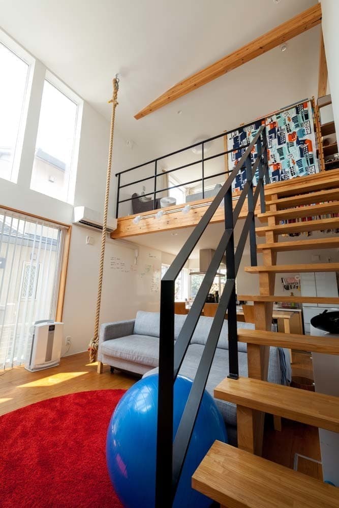 大きな吹抜けには、ご主人様とお子様のトレーニング用に吊り下げたロープや、家族のコミュニケーションツールにもなっているホワイトボードの壁など、空間全体に遊びが詰まった家となっています。