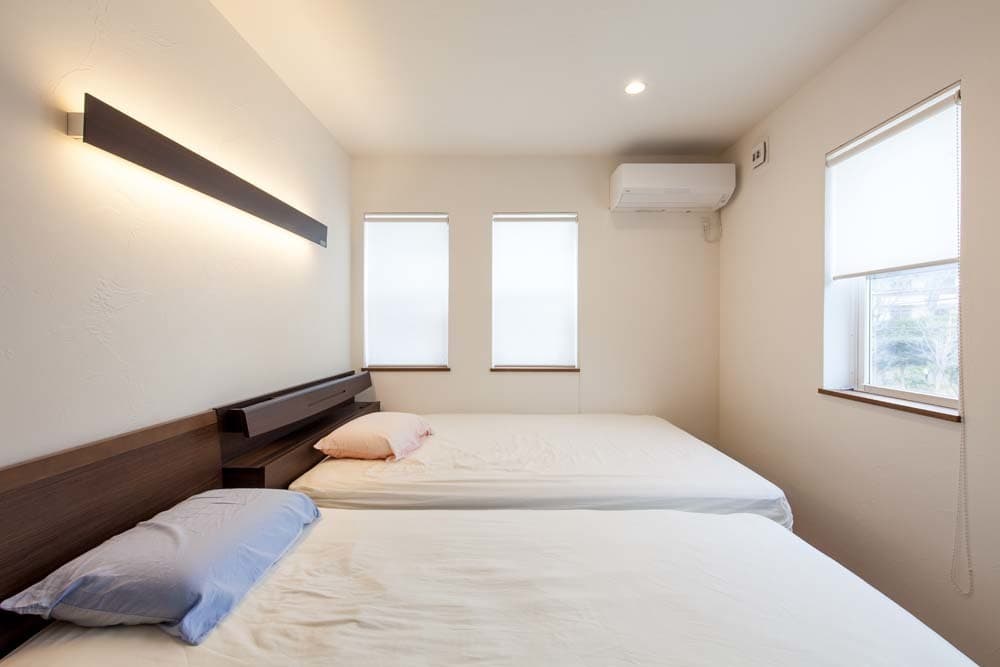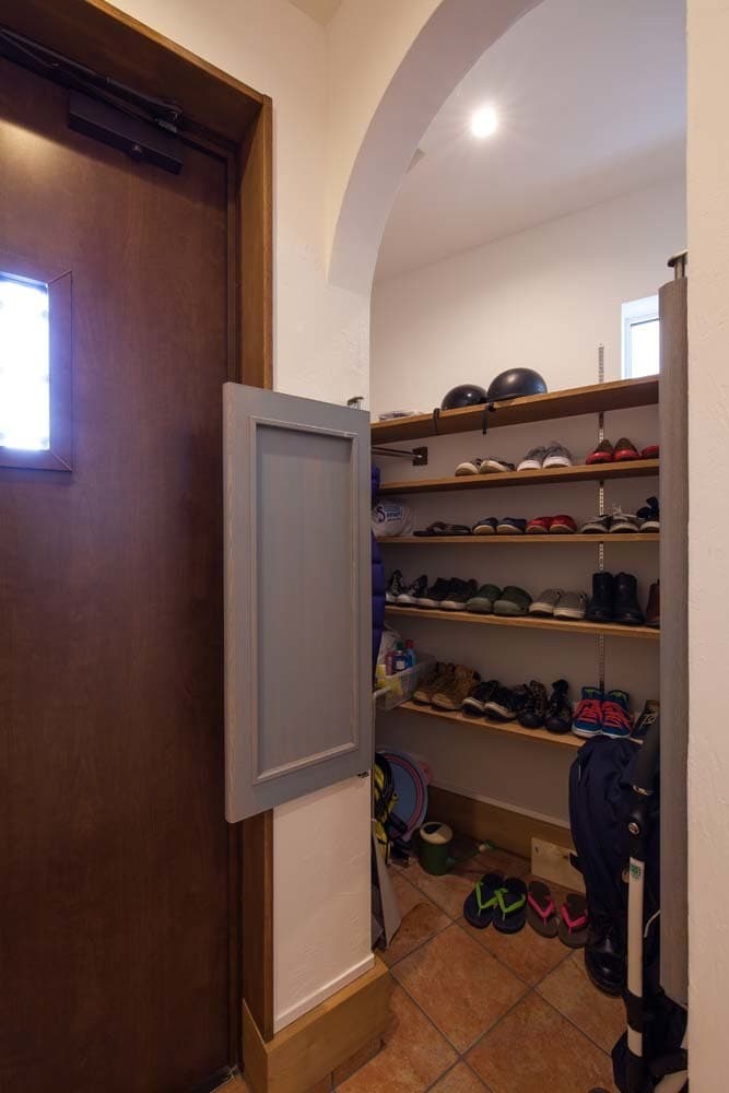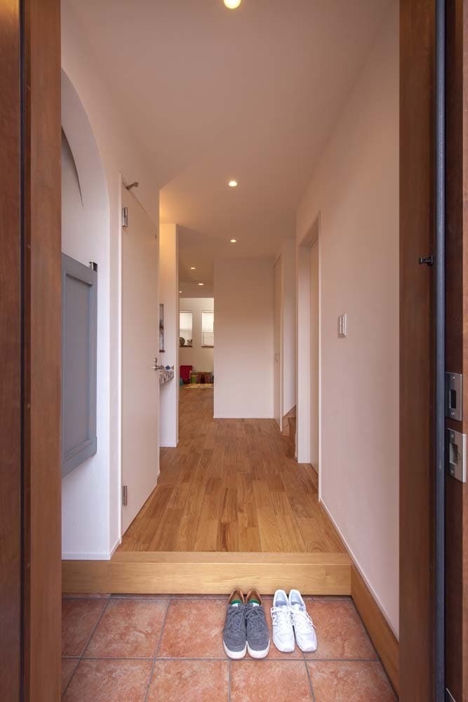 サーフィンをするご主人のために玄関横にはシャワーがあり、吹き抜けのあるリビングも開放的で明るい空間となっています。