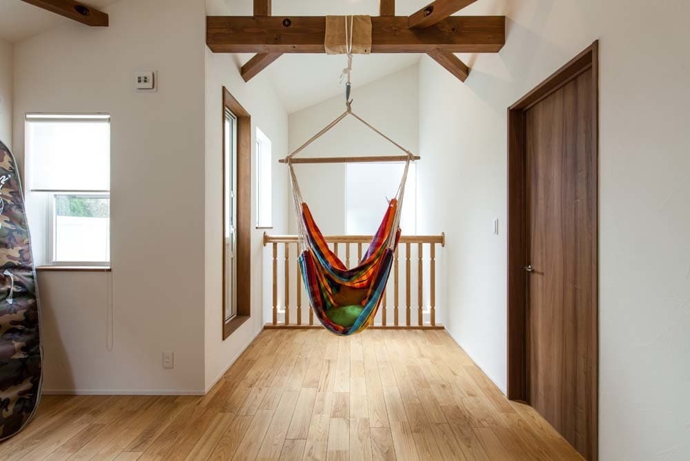 2階のホールにはハンモックがあり、今はまだ赤ちゃんのお子さんと将来楽しく遊ぶ姿が想像できる空間です。