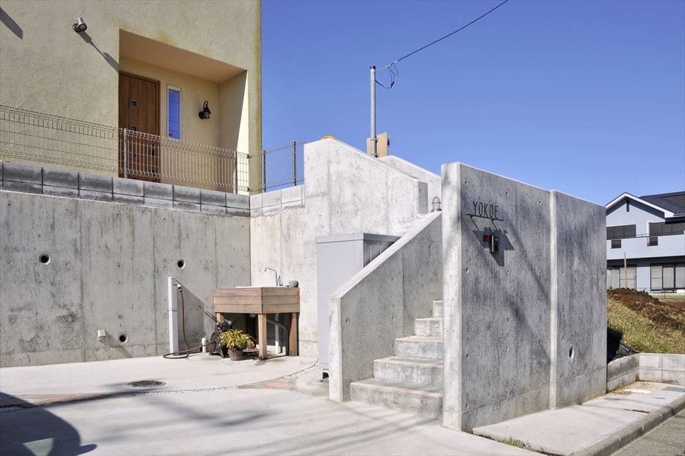 住宅地の高低差を利用して、駐車スペースから建物までトータルでデザインした、シンプルで素材感のある外観デザインの家です。