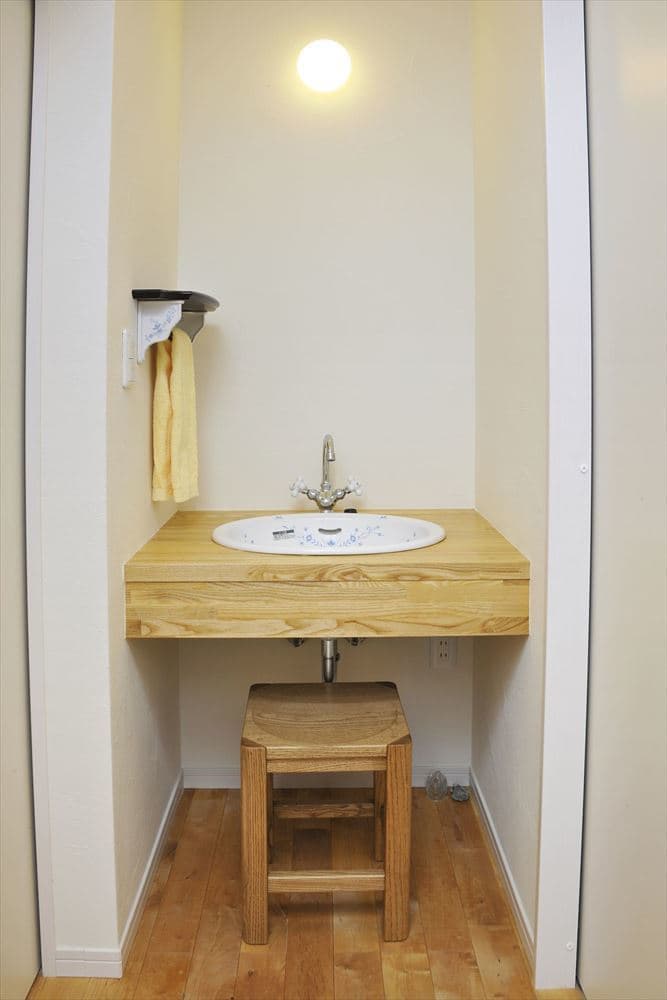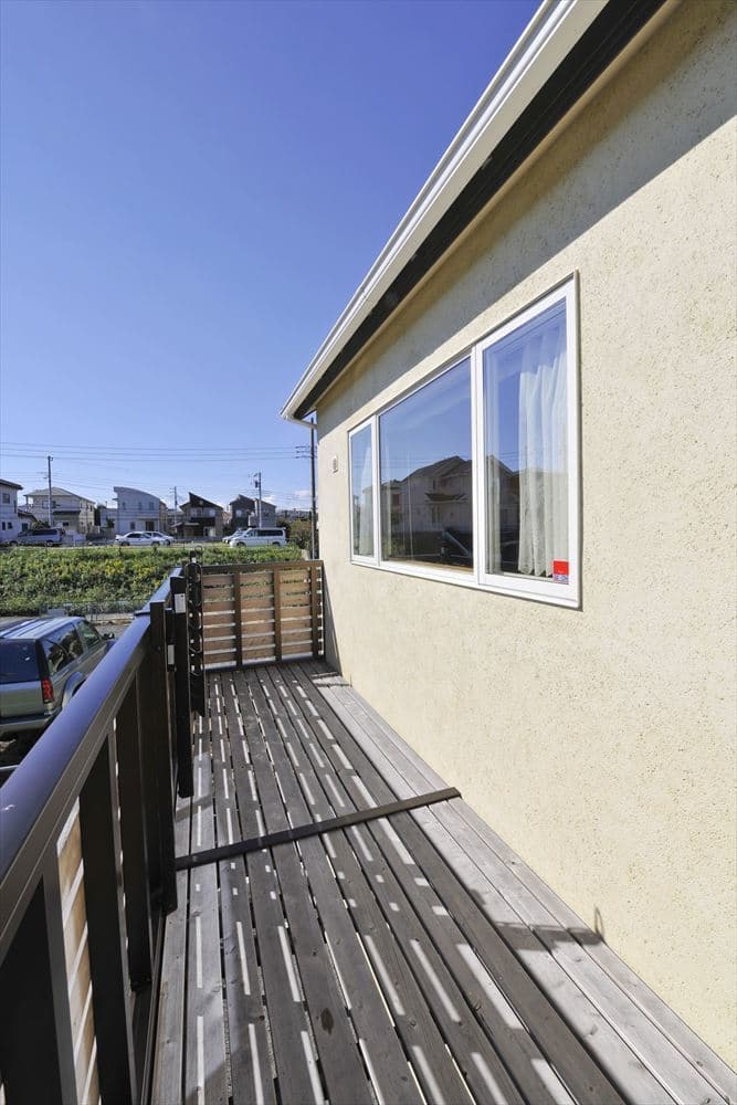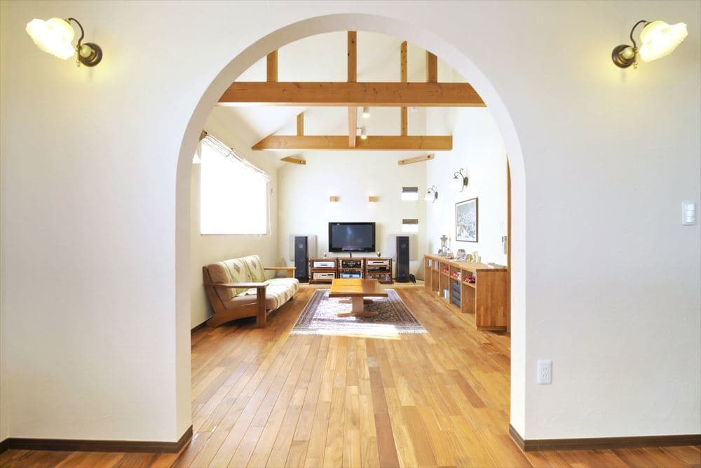内装は、無垢のチークの床材や珪藻土の塗り壁が優しいテイストを醸し出しています。そして、リビングとダイニングを仕切る、アールの付いた間仕切り壁がとてもおしゃれで、まるでカフェのような雰囲気の空間を実現しています。キッチンは奥様のこだわりをかなえるために、収納やカウンター、ワークスペースまでも造作工事でデザインした、オリジナリティ溢れる使いやすいキッチンになっています。