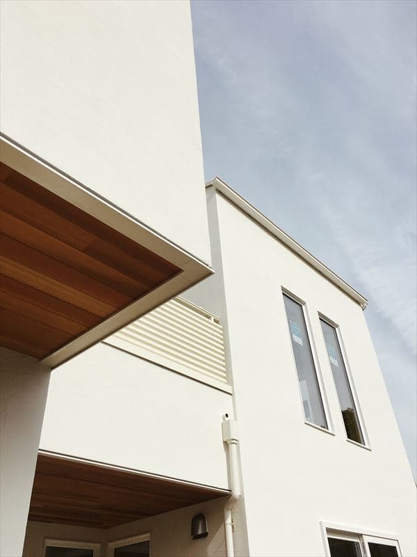 白い塗り壁と無垢の木で仕上げた外観は、森戸の落ち着いた街並みに溶け込んでいます。