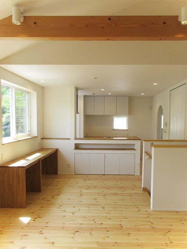 開放感のある勾配天井の2階リビングや、ラボワットらしい無垢床材と珪藻土塗り壁の自然素材も特徴となった木の家です。