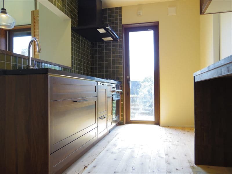 ご近所のお友達とゆっくり会話を楽しむために広々とした土間に作った木製のベンチや喫茶店のように落ち着いた雰囲気のキッチン、レトロなデザインガラスをはめ込んだ造作の内窓など。