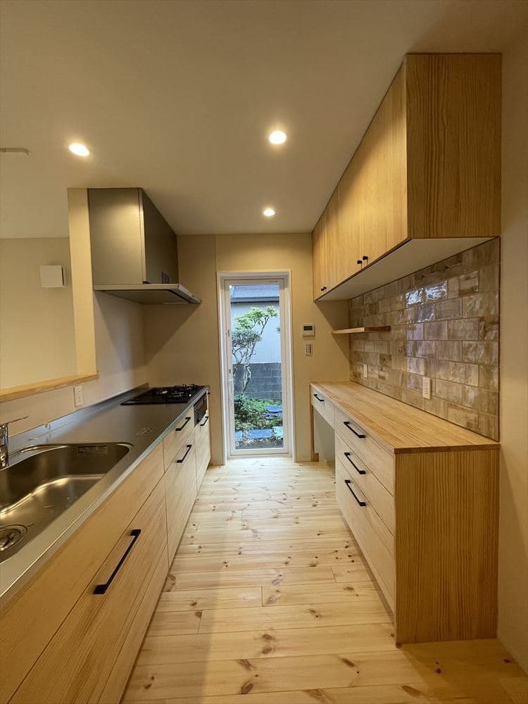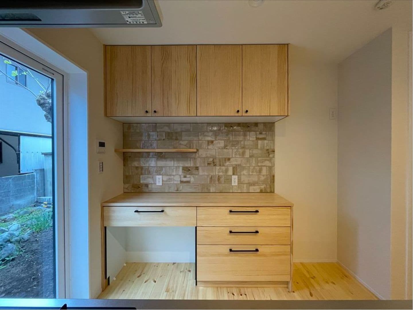 内装は、床はパイン無垢材、壁は珪藻土を使い、更にキッチンや洗面台も木製扉のキッチン(ウッドワン:スウィージー)を採用し、ラボワットらしいナチュラなテイストとなりました。