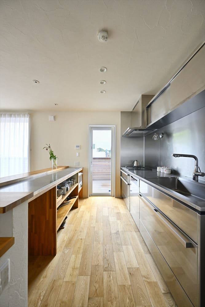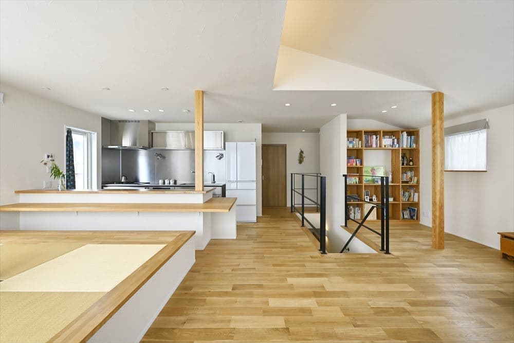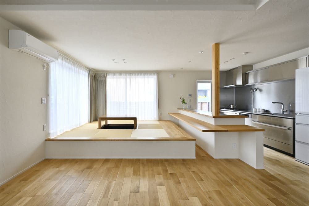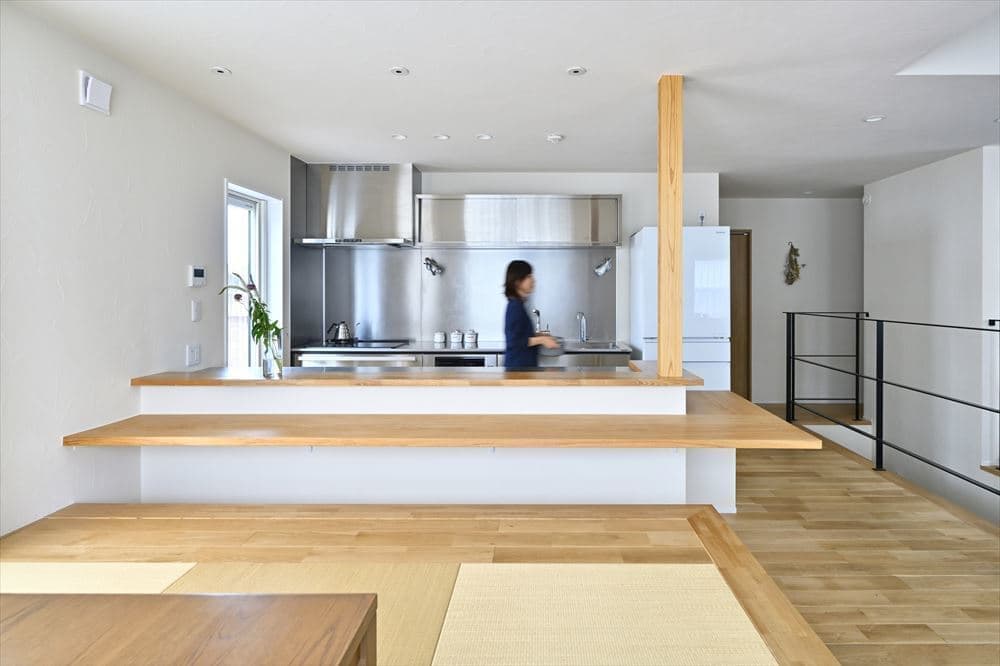 キッチンに繋がる無垢材で制作した大きめのカウンターは、小上がりの畳スペースに腰かけて食事ができるようになっています。
