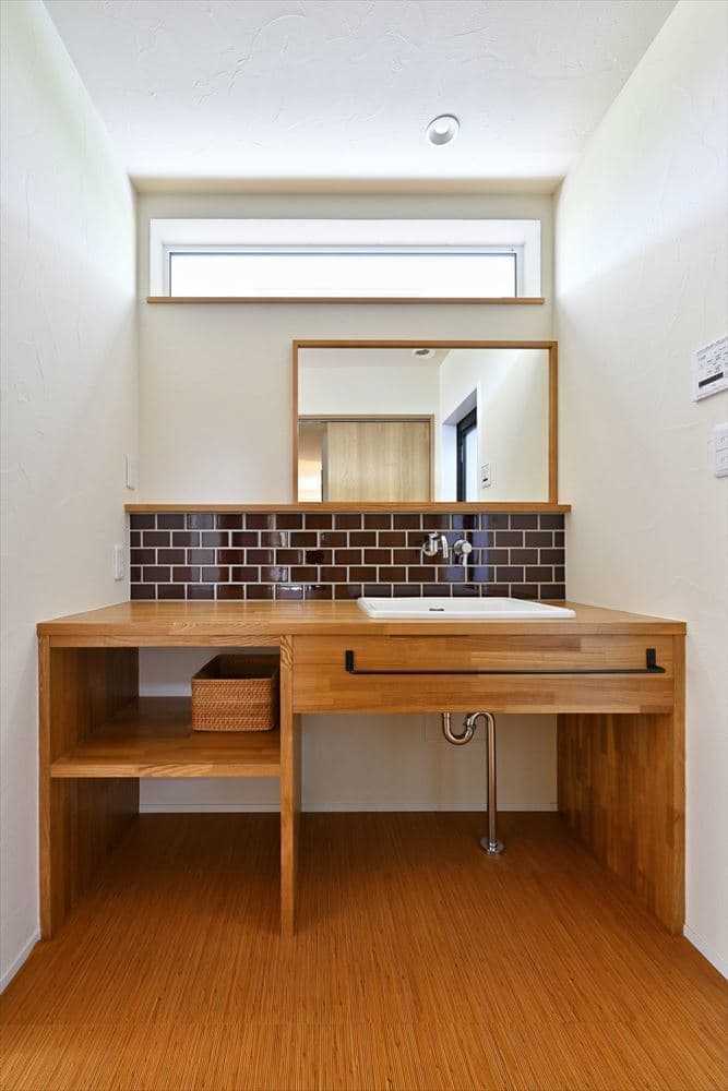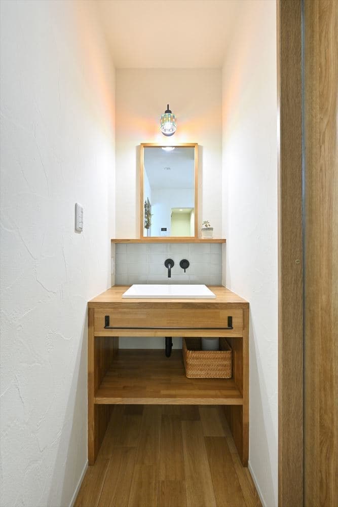 無垢材の床や珪藻土の壁、造作の棚など、全体的にナチュラルなラボワットテイストで仕上っています。