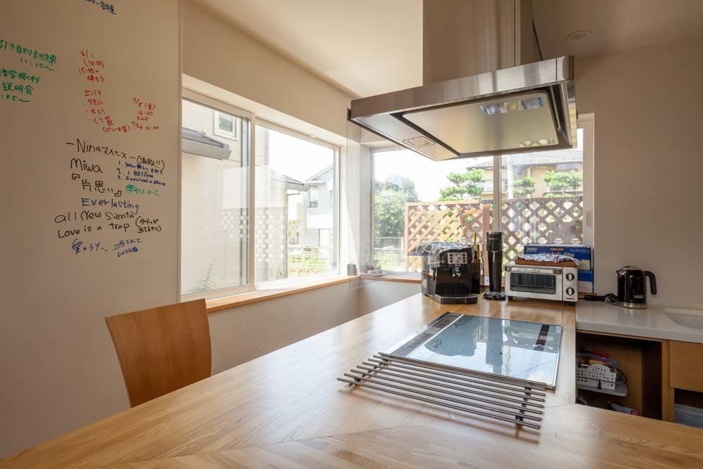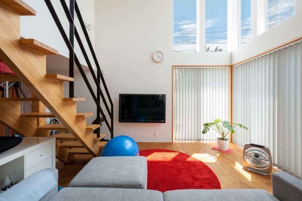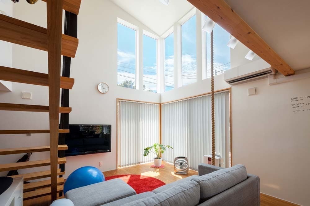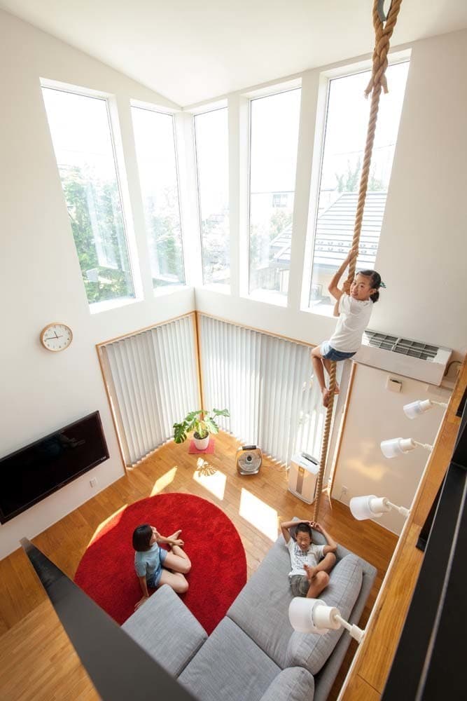大きな吹抜けには、ご主人様とお子様のトレーニング用に吊り下げたロープや、家族のコミュニケーションツールにもなっているホワイトボードの壁など、空間全体に遊びが詰まった家となっています。