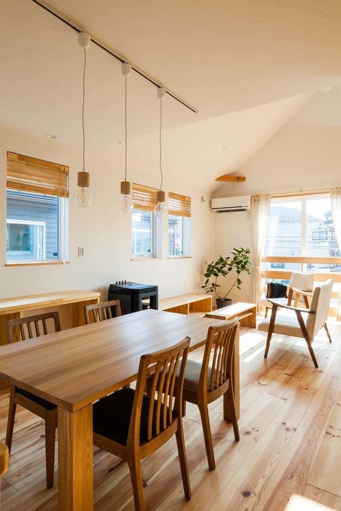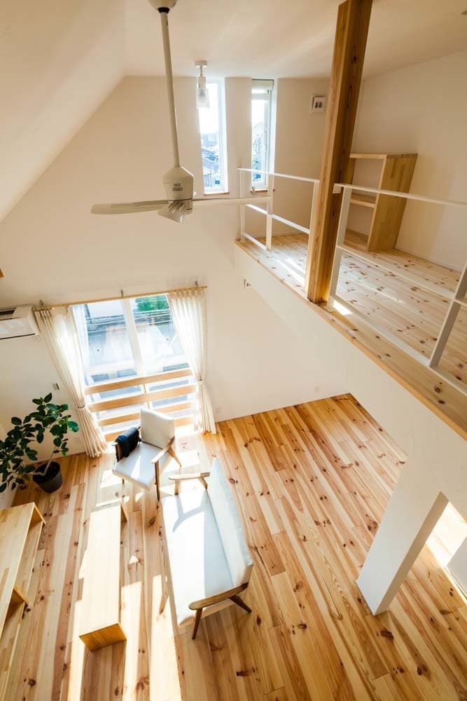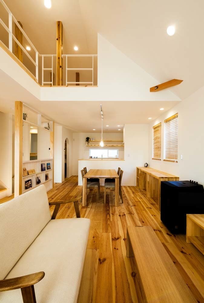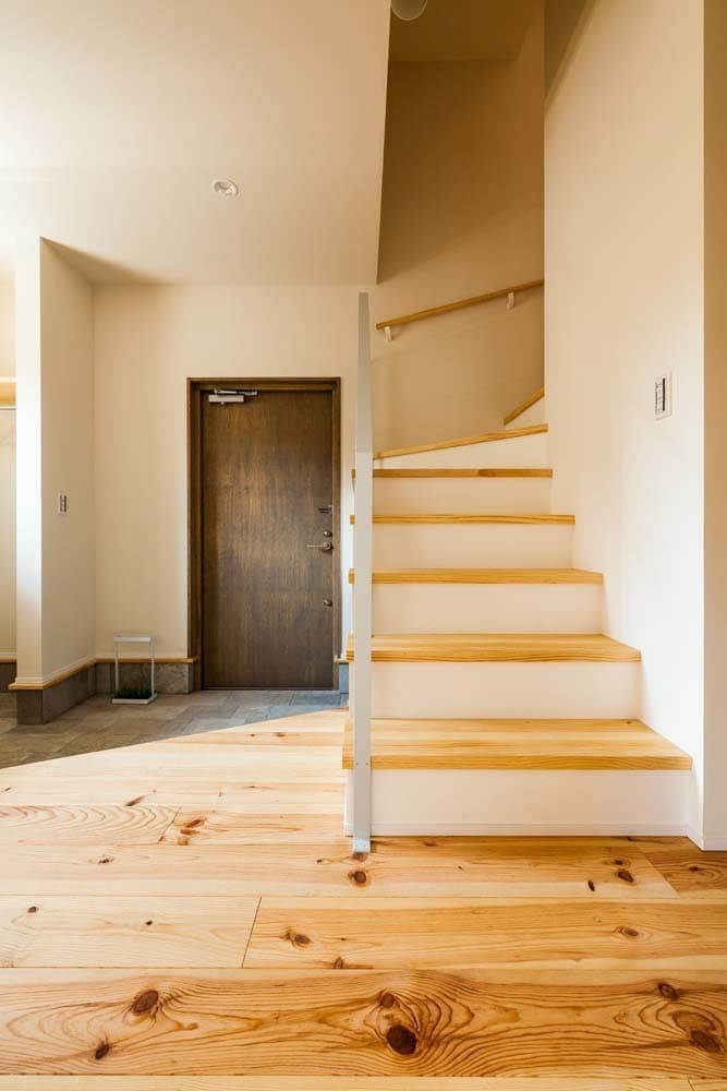 木製の玄関ドアからオープンな階段を上ると、勾配天井がとても開放感のあるリビングにつながります。