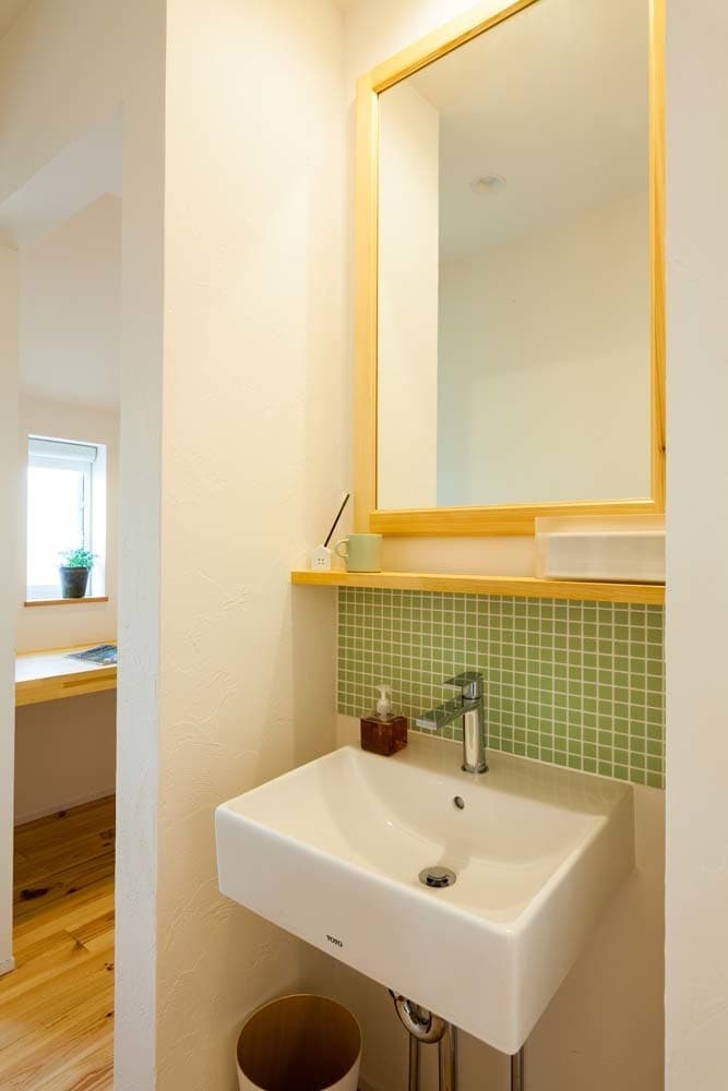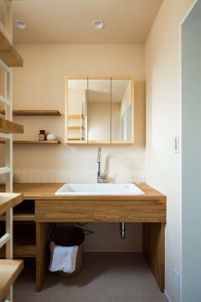 キッチンはオーダーでデザインしたラボワットオリジナルキッチン。使いやすさとおしゃれなデザインのキッチンからはリビングダイニングと、ウッドデッキバルコニーが見渡せます。他にもオリジナルデザインの洗面台や造作収納など、手作り感あふれるしつらえもたくさんあります。