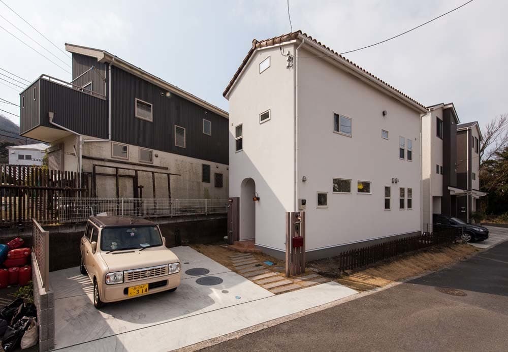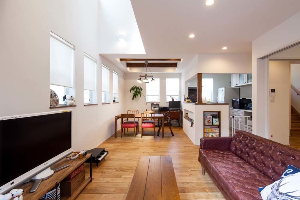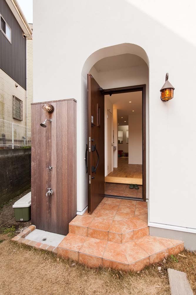 サーフィンをするご主人のために玄関横にはシャワーがあり、吹き抜けのあるリビングも開放的で明るい空間となっています。