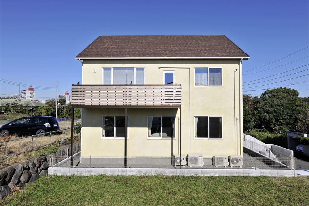 住宅地の高低差を利用して、駐車スペースから建物までトータルでデザインした、シンプルで素材感のある外観デザインの家です。