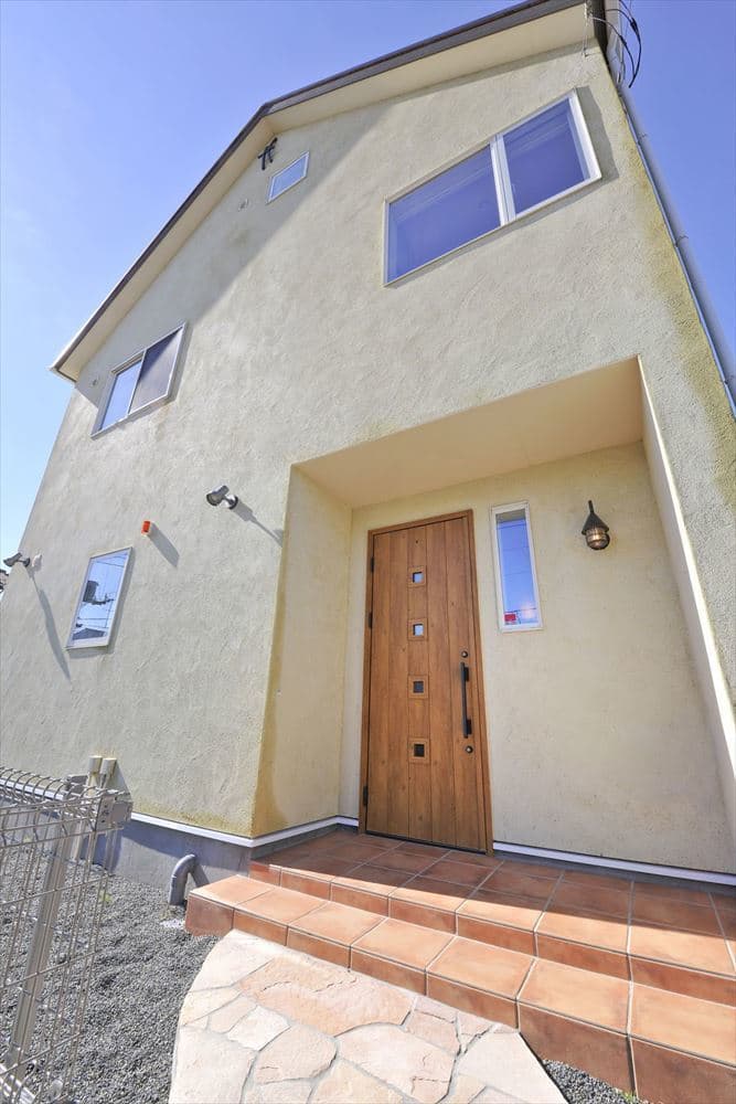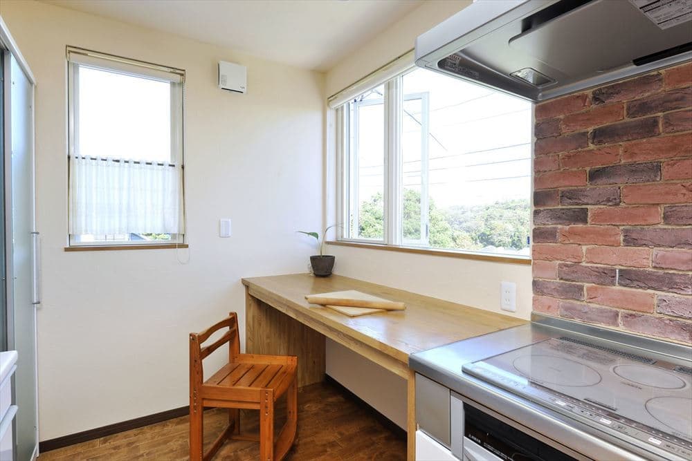 内装は、無垢のチークの床材や珪藻土の塗り壁が優しいテイストを醸し出しています。そして、リビングとダイニングを仕切る、アールの付いた間仕切り壁がとてもおしゃれで、まるでカフェのような雰囲気の空間を実現しています。キッチンは奥様のこだわりをかなえるために、収納やカウンター、ワークスペースまでも造作工事でデザインした、オリジナリティ溢れる使いやすいキッチンになっています。